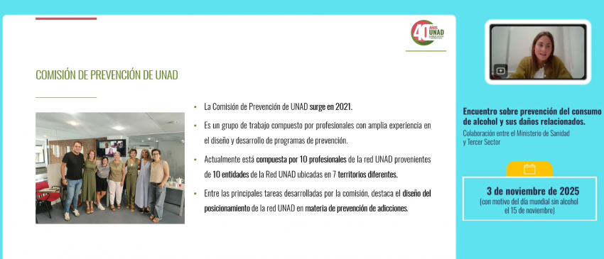 Eider Hormaetxea, coordinadora de la comisión de Prevención de UNAD, ha participado en la sesión en representación de la red de adicciones de tal manera que ha resaltado la trayectoria histórica de la labor preventiva en España y en la propia red. Durante su discurso, Hormaetxea ha trasladado el "firme apoyo" de UNAD al Proyecto de Ley, actualmente en trámite parlamentario, al considerarlo "una norma imprescindible para la salud pública y que no puede demorarse más". Según ha defendido, "las medidas de protección previstas, especialmente aquellas relativas a la publicidad, patrocinio y promoción del alcohol en entornos digitales, son fundamentales para reducir la exposición precoz y prevenir consumos de riesgo".
